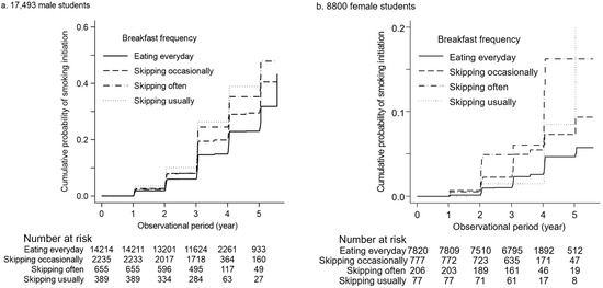 This retrospective cohort study, including 17,493 male and 8880 female university students at a national university in Japan, aimed to clarify a sex-specific dose-dependent association between skipping breakfast and smoking initiation over a 6-year observational period. The results of this study clarify the clinical relevance of skipping breakfast to smoking initiation in adolescents.