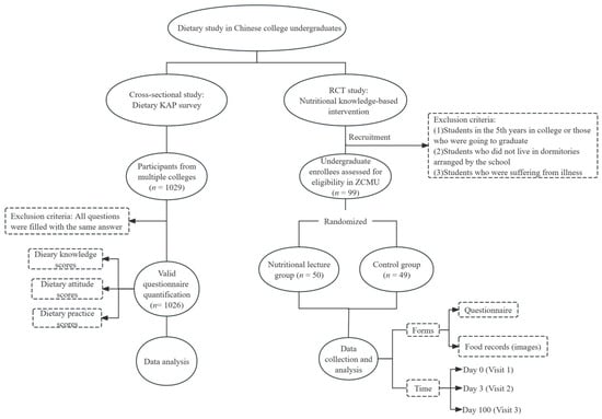 In this study, we combined the KAP health education model to investigate the dietary status of Chinese undergraduates, especially in Zhejiang province, from multiple perspectives of dietary knowledge, dietary attitude and dietary practice, and studied the relationship among the three factors along with many other underlying factors that might influence dietary literacy, which seemed not very clear in previous studies. Moreover, in addition to a cross-sectional survey, preliminary targeted nutritional knowledge-based interventions were carried out on participants recruited from ZCMU in this study to explore whether a nutritional knowledge-based lecture could improve dietary literacy. Additionally, in the RCT study, various methods, including questionnaires and dietary records based on food images, were used to estimate participants’ dietary behaviors more scientifically and accurately. After that, the intervention impact was evaluated, providing reference significance for more long-term and effective intervention measures in the future.