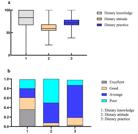 Then, college undergraduates from multiple universities in Zhejiang were enrolled and asked to fill out the “Undergraduate dietary literacy KAP questionnaire” via the platform “Questionnaire Star” of WeChat https://www.wjx.cn/vm/YDgDLEJ.aspx# (accessed on 10 May 2022). After invalid questionnaire respondents (all options were filled with the same answer) were excluded, remaining valid questionnaires were scored to obtain dietary knowledge, attitude and practice scores according to the criteria in Supplemental Table S1. To have a clear understanding of the current dietary KAP status among undergraduates, all the scores were standardized by the hundred-mark system and participants were ranked as “excellent”, “good”, “average” and “poor” based on 90 points, 80 points and 60 points.