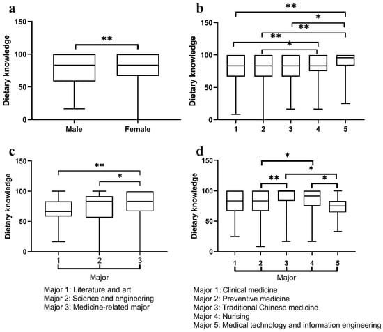 Comparisons of dietary knowledge scores of undergraduates among different sex, college years and majors. (a) Sex and dietary knowledge scores: female undergraduates achieved higher dietary knowledge scores than male students. (b) College year and dietary knowledge scores: upper-grade undergraduates achieved higher dietary knowledge scores than lower-grade students. (c) Major and dietary knowledge scores: medicine-related undergraduates achieved higher dietary knowledge scores than students majoring in literature and art and science and engineering. (d) Different medicine-related major and dietary knowledge scores: undergraduates majoring in nursing and traditional Chinese medicine achieved higher dietary knowledge grades than students majoring in preventive medicine and medical technology and information engineering. * p < 0.05, ** p < 0.001.