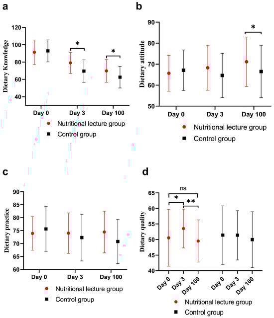Impact of nutritional lecture on dietary literacy. (a) Significant difference in dietary knowledge scores shown on day 3 and day 100 after intervention and insignificant difference shown on day 0 between the two groups. (b) Significant difference in dietary attitude scores shown on day 100 and insignificant difference on day 0 and day 3 between the two groups. (c) Insignificant difference in the dietary practice scores between the two groups shown on days 0, 3 and 100. (d) Trends of dietary quality of the two groups. The nutritional lecture group showed a significant improvement in dietary quality scores on day 3 and a significant decrease on day 100. * p < 0.05, ** p < 0.001, ns (not significant).