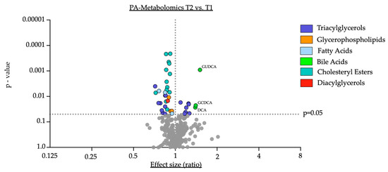 PA-Metabolomics T2 vs. T1. Data are presented in the x-axis as fold change, calculated as the ratio between serum concentration (µmol/L) at T2 divided by serum concentration at T1. Individual p-values are provided on the y-axis, determined by a comparison of means of serum concentration between the two timepoints using paired Student’s t-test or Wilcoxon test where eligible. Grey dots indicate not significantly altered metabolites. Key: GUDCA—Glycoursodeoxycholic acid; DCA—deoxycholic acid; GCDCA—Glycochenodeoxycholic acid.