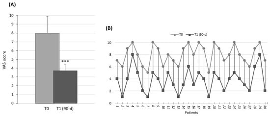 A statistical analysis was performed using nonparametric tests. The differences among groups of data, before (T0) and after (T1—90 d) the treatment, were tested by the Kruskal–Wallis test. The data are reported as mean ± standard deviation (SD). The differences observed have been considered statistically significant at p < 0.05.
