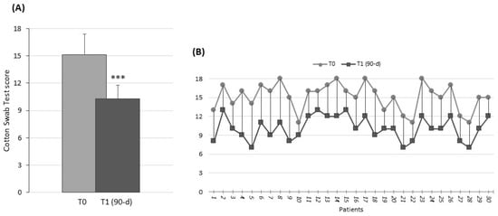The patients also showed a statistically significant pain reduction in cotton swab test scores at the end of treatment (on a 0–3 range for the sum of all investigated area); the value was 10.3 ± 1.5 compared with 15.1 ± 2.3 at baseline (