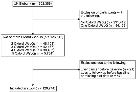 After excluding participants with liver cancer before baseline, participants lost to follow-up before baseline and participants with errors in dietary data, 126,744 participants who had completed two or more Oxford WebQs remained (Figure 1).
