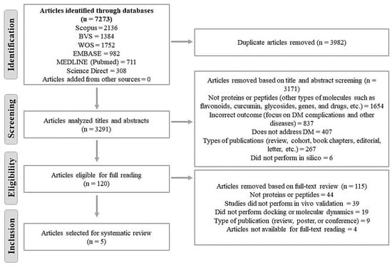 A total of 7273 articles were initially identified, with 3982 articles removed as duplicates. Out of the 3291 studies subjected to title and abstract screening (the initial screening phase), 120 articles were selected for full-text reading, of which 5 articles were ultimately included in this systematic review (SR). During the initial screening phase, 52.2% of articles (n = 1654) were excluded because they did not involve studies with proteins and/or peptides; 26.4% (n = 837) focused on diabetic neuropathies, cancers, and Alzheimer’s, among other diseases or diabetic complications, rather than on DM itself; 12.8% (n = 407) did not discuss DM; 8.4% (n = 267) were not original articles, and 0.2% (n = 6) did not involve in silico studies. In the final full-text reading phase, 38.3% of articles (n = 44) were excluded for not presenting evaluations with therapeutic agents of interest (proteins and/or peptides of natural origin), 33.9% of studies (n = 39) did not conduct in vivo assays with the same peptides for validation of the data obtained in silico, 16.5% (n = 19) did not conduct docking or molecular dynamics, 7.8% (n = 9) were not original articles, and 3.5% (n = 4) were not found or made available through contact with corresponding authors (Figure 1).
