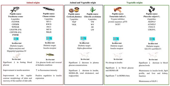 The results obtained in this SR demonstrate the heterogeneity of the origin and amino acid composition of proteins and/or peptides, highlighting those of animal origin (fish and mollusks) and vegetable origin (green microalgae, tamarind seeds, and black beans), regarding their efficacy on various therapeutic targets (DPP-IV, AAM, RI, GLUT2, and SGLT1) of DM. However, per this SR, in silico studies can be considered strategic in the search or screening of new therapeutic agents, considering that all those agents analyzed in silico, included in this SR, were also reassessed in vivo and maintained the consistent potential for acting in the treatment of DM. Therefore, they serve to guide future research, particularly clinical trials, and aid in the quest for novel treatments for this disease.