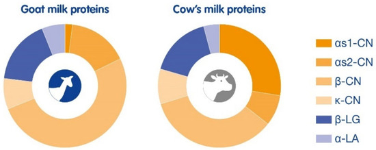 Composition of goat milk proteins compared to cow’s milk proteins. Goat milk protein distribution: αS1-CN 1%, αS2-CN 16%, β-CN 51%, κ-CN 8%, β-LG 17%, and α-LA 6%. Cow’s milk protein distribution: αS1-CN 27%, αS2-CN 8%, β-CN 34%, κ-CN 9%, β-LG 16%, and α-LA 4%.