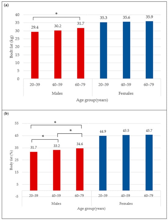 Body fat (kg) (a) and body fat percentage (b) across age groups in males and females. * indicates mean difference at p < 0.05.