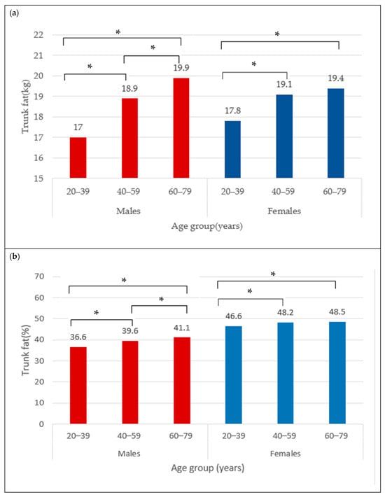 Trunk fat (kg) (a) and trunk fat percentage (b) across age groups in males and females. * indicates mean difference at p < 0.05.