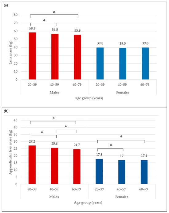 Lean mass (kg) (a) and appendicular lean mass (b) across age groups in males and females. * indicates mean difference at p < 0.05.