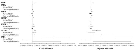For anthropometric and body composition indicators, zBMI (aOR 1.19, 95% CI 1.12 to 1.27), FM% (aOR 1.03, 95% CI 1.02 to 1.03), FMI (aOR 1.08, 95% CI 1.04 to 1.11), CFMI (aOR 1.45, 95% CI 1.13 to 1.86), and FMR (aOR 3.03, 95% CI 2.04 to 4.50) were associated with increased odds of high OSA risk, while FFMI (aOR 1.01, 95% CI 0.95 to 1.07) and TMMI (aOR 1.01, 95% CI 0.95 to 1.08) were not associated with high OSA risk. Subgroup analyses showed that FM% (aOR 1.02, 95% CI 1.01 to 1.04), FMI (aOR 1.07, 95% CI 1.02 to 1.11), CFMI (aOR 1.88, 95% CI 1.26 to 2.80), and FMR (aOR 2.27, 95% CI 1.18 to 4.36) raised the risk of high OSA in overweight and obese children but not in normal-weight children. FFMI and TMMI, on the other hand, had no effect on OSA risk across BMI categories (p < 0.05, Figure 1).