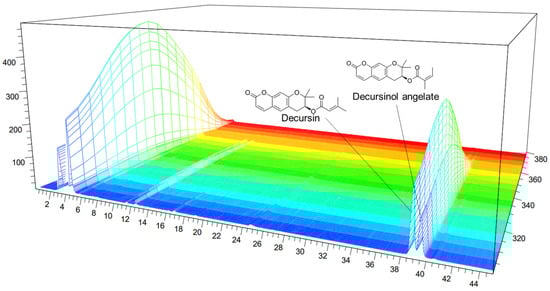The decursinol and decursin angelates in AG were 11.0386 and 5.6396 mg/kg d.m.−1, respectively. Figure 1 shows the analytical UV spectra (330 nm) of decursin and decursinol angelates. As decursin and decursinol angelate are structural isomers with the same molecular formula (C19H20O5) and molecular weight (328 nm), they were analyzed in the same wavelength band.