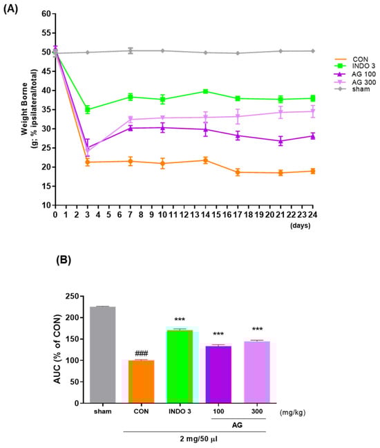 Effect of AG on improving hind limb weight bearing in the osteoarthritis (OA) model; (A) the weight bearing of MIA rats in the AG 100, AG 300, and INDO 3 treatment groups for 24 days; (B) the AUC was measured from an incapacitance meter. ### p < 0.001 vs. sham, *** p < 0.001 vs. CON using one-way analysis and Dunnett’s test. AUC: area under the curve; CON: control; INDO 3: indomethacin 3 mg/kg; MIA: monosodium iodoacetate.