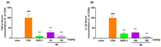 Effects on cytokines in the serum. (A) TNF-α and (B) IL-1β expression in the serum of MIA rats. Rats were administrated AG 100 and 300 for 24 days. ### p < 0.001 vs. sham, *** p < 0.001 vs. CON using one-way ANOVA and Dunnett’s test.