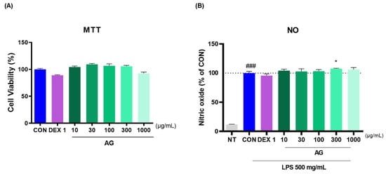 Effects of AG in RAW264.7 cells. (A) Cell viability and (B) LPS-treated NO generation. ### p < 0.001 vs. NT, * p < 0.05 vs. CON using one-way ANOVA and Dunnett’s test. DEX: dexamethasone; LPS: lipopolysaccharide; NT: non-treated.