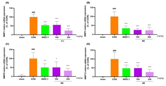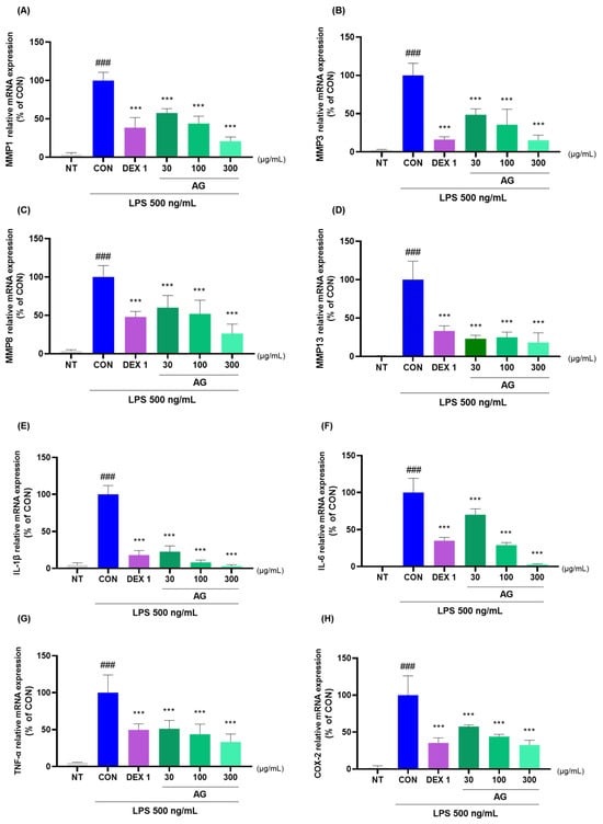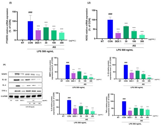 AG and DEX 1 treatments reduced matrix metalloproteinase (MMP)-1, MMP-3, MMP-8, MMP-13, IL-1β, IL-6, TNF-α, COX-2, PTGER2, and NOS2 mRNA levels (Figure 7A–J). AG in LPS-treated RAW264.7 cells decreased the protein levels of inflammatory cytokines and mediators (Figure 7K). Furthermore, AG reduced the expression of MMP-3, IL-1β, IL-6, and TNF-α, as observed using western blot analysis. Moreover, AG exhibited anti-inflammatory effects comparable to those of DEX 1 against all cytokines.
