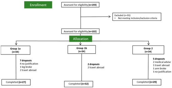 The study was a non-blinded RCT with a 12-week combined intervention of an MD-type diet and a controlled and planned physical exercise, with 3 parallel arms and a 1:1:1 allocation. Eligible participants were randomized using computer-generated numbers. Therefore, the study encompassed: (a) a negative control (Group 1a), with no intervention; (b) a positive control (Group 1b) with physical exercise intervention, supervised in loco with exercise specialists (2 x/week, 2 h), and no dietary intervention; and (c) an intervention group (Group 2), conveying a diet plus the same physical exercise plan. In Figure 1, we present the flow chart of participant recruitment and allocation. This intervention study aimed to evaluate the clinical benefit in adding a specific diet (an MD-type diet) to a physical exercise plan. To that end, the proposed study evaluated the effect of the physical exercise isolated from the diet to: (1) exclude the putative beneficial potential of the physical exercise of the combined program, used to evaluate the impact of exercise on CVD risk factors; and (2) better evaluate the combined effect of the diet and physical exercise.