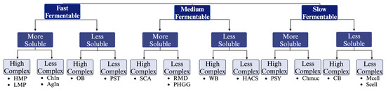 Dietary fibers were classified based on physicochemical properties, including fermentability rate, solubility, and complexity (Figure 1). Fibers were initially assigned to these categories based on the existing literature.