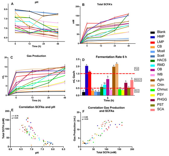 pH variations (A), total SCFA (B), and gas production (C) during the in vitro healthy human fecal fermentation of the sixteen selected fibers. Fermentation rate (D) was determined within the 6 h time point. Correlation analysis between total SCFAs and pH (E) and between gas production and total SCFAs (F). Blank was used as a negative control. Triplicates of each fiber (n = 3) for every time point are shown in the figure. Different letters between bars indicate significant differences (p < 0.05).