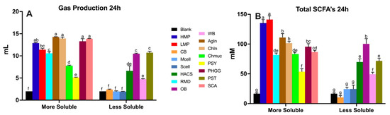 Comparison of gas production (A) and total SCFA (B) production at the 24 h time point during in vitro fecal fermentation depending on fiber solubility. Blank was used as a negative control. Triplicates of each fiber (n = 3) for every time point are shown in the figure. Different letters between bars indicate significant differences (p < 0.05).