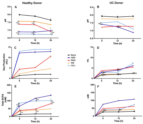 Comparing healthy vs. UC donor fiber fermentation parameters to assess the role of gut bacterial dysbiosis in fiber metabolism. Triplicates of each fiber (n = 3) for every time point are shown in the figure. (ns) means no significant difference; rest of the comparisons with no legend mean that significant differences were observed at p < 0.05. (A,B) pH measurements, (C,D) gas production and (E,F) total SCFA concentration at the distinct fermentation timepoints using (A,C,E) healthy donor bacteria and (B,D,F) UC donor bacteria as inoculum.