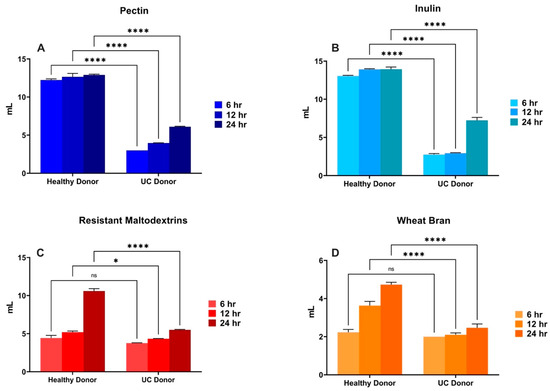 Comparison of healthy vs. UC donor effect on the gas production of each of the fiber treatments. Triplicates of each fiber (n = 3) for every time point are shown in the figure. An asterisk (*) and horizontal line represent a statistical difference (p ≤ 0.05) between the two groups. (****) represent p ≤ 0.0001 and (ns) means no statistical difference. Gas production differences at the distinct fermentation timepoints between the healthy and UC donor within the (A) HMP, (B) ChIn, (C) RMD, and (D) WB treatments.