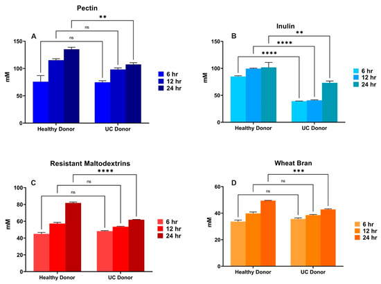 Comparison of healthy vs. UC donor effect on total SCFA production of each of the fiber treatments. Triplicates of each fiber (n = 3) for every time point are shown in the figure. Asterisks (**) and horizontal line represent a statistical difference (p ≤ 0.01) between the two groups. (***) represents p ≤ 0.001, (****) p ≤ 0.0001 and (ns) means no statistical difference. Total SCFA production differences at the distinct fermentation timepoints between the healthy and UC donor within the (A) HMP, (B) ChIn, (C) RMD, and (D) WB treatments.