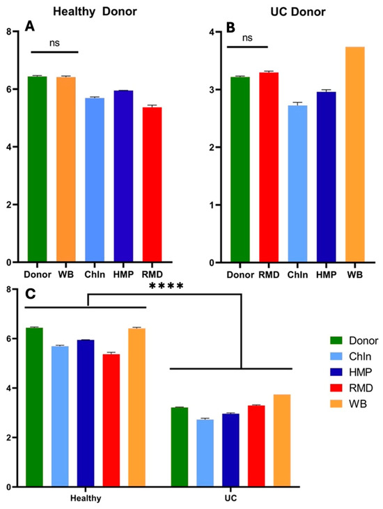Bacterial community analysis resulted in WB being the only fiber that did not alter from the healthy donor’s initial Shannon Index value (Figure 7A). For the rest of the fiber treatments, alpha diversity was significantly different from the initial healthy donor sample. UC is driven by a shift in bacterial communities, especially in their richness and evenness. The Shannon Index, as a reference for richness and evenness, showed that the only fiber that did not differ within the UC donor was RMD. Interestingly, ChIn and HMP resulted in decreased diversity, while WB increased it. Significant differences were found between the donors, independent of the fiber (Figure 7C).