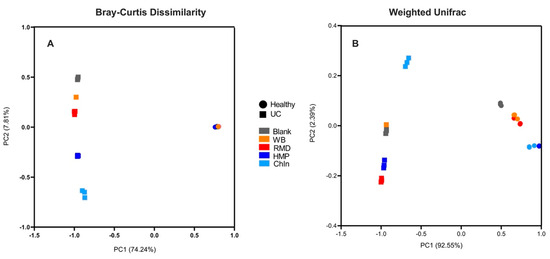 To determine shifts in community structure (beta diversity), Bray–Curtis dissimilarity index (Figure 8A) and Weighted Unifrac (Figure 8B) were used. The PCoA plots show distinct clustering of healthy and UC donors by axis 1 (PC1), which explains 74.24% of the variance in the Bray–Curtis and 92.55% in the Weighted Unifrac. This can be attributed to the differences found between the donor communities. Dissimilarities between the fiber treatments within the donors can be explained by axis 2 (PC2), which accounted for only 7.81% for Bray–Curtis and 2.39% for Weighted Unifrac. Overall, both axes explained a total of 82.05% and 94.94% of the variations between the different bacterial communities for the Bray–Curtis and Weighted Unifrac, respectively. Analyses of the beta diversity also showed a common behavior of the samples in both measurements. Fiber treatments belonging to the healthy group are closely clustered with each other, while the variations observed between the fiber treatments in the axis were mostly due to UC-associated microbial dysbiosis.