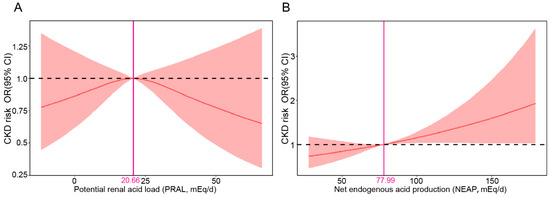 RCS of the correlation between the CKD risk (ORs) and PRAL (A) and NEAP (B). Pink solid line indicates cut-off value.
