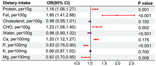 In the energy-adjusted model, we found that protein and fat increased the risk of CKD by 16% (OR: 1.16, 95% CI: 1.06–1.27) for each 10 g increased intake, and each 100 g fat and carbohydrate intake may increase the risk of CKD by 95% (OR: 1.95, 95% CI: 1.41–2.68) and 21% (OR: 1.23, 95% CI: 1.08–1.4) respectively. In addition, calcium was also observed to increase the risk of CKD by 20% for each 100 g increased intake. However, for every 100 mg reduction in energy-adjusted phosphorus and magnesium intake, the risk of CKD may decrease by 17% and 18%, respectively (Figure 3).