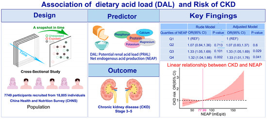This study had several limitations. Firstly, as a cross-sectional study, it could not prove the cause-and-effect relations between DAL and CKD. Secondly, although PRAL and NEAP are widely used indicators of overall DAL, it is calculated by diet but not from the directly measured data. Thirdly, since dietary assessment came from the recall of food intake by the participants, recall bias could not be avoided, although we tried several ways to minimize it. Fourthly, due to the presence of some missing data (sampling framework, weight information, serum calcium, and serum phosphorus) in this population-based study, the conclusions may have certain limitations when applied to a broader population, particularly the Chinese population.