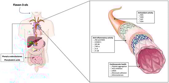 The cardioprotective properties attributed to flavan-3-ols could be associated with their microbial-derived metabolites PVLs and PVAs through their anti-inflammatory activity, hypotensive properties, and ability to reduce the adhesion of monocyte to endothelial cells, preventing atherosclerosis development as represented in Figure 1. 5-(3′,4′-dihydroxyphenyl)-gamma-valerolactone has been tested for its anti-inflammatory properties, showing the capacity to inhibit the expression of iNOS [128] which increased activity has been correlated with heart failure [129]. Moreover, two microbial-derived metabolites 5-(3,4,5-trihydroxyphenyl)-gamma-valerolactone and 5-(3,5-dihydroxyphenyl)-gamma-valerolactone showed hypotensive properties in an in vivo study conducted on rats [130]. Hydroxyphenyl valeric acids, also derived by flavan-3-ols metabolism, demonstrated a strong inhibitory activity of angiotensin I-converting enzymes (ACEs) [130]. The cardioprotective effect of the microbial-derived metabolite 5-(3′,4′-dihydroxyphenyl)-gamma-valerolactone has been demonstrated by another in vitro study, demonstrating that the treatment prevents monocyte adhesion to endothelial cells through downregulation of VCAM-1 in tumor necrosis factor-alpha (TNF-alpha)-treated cells [131]. This mechanism could be attributed to a downregulation of phosphorylation and the activation of NF-κB [131]. Microbial catabolism of flavan-3-ols leads also to the production of phenolic acids [132] showing anti-inflammatory, antioxidant, and cardioprotective effects. Among catabolic metabolites derived by flavan-3-ols, trans-caffeic acid and 3,4-dihydroxyphenylpropionic acid (3,4-DHPP) inhibited NO production in lipopolysaccharides (LPS)-treated RAW264.7 cells [133]. Furthermore, in vitro treatment with benzoic acid-sulfate, vanillic acid-glucuronide, and protocatechuic acid-3-sulfate leads to a reduction in TNF-alpha secretion induced by LPS stimulation [134]. Similar results demonstrated a dose-dependent response to protocatechuic acid treatment, leading to a reduction in TNF-alpha, interleukin 6 (IL-6), IL-1 beta, and prostaglandin E2 production as well as a reduced expression of toll-like receptor 4 (TLR4), activation of NF-κB, and MAPKs [135]. In another study, protocatechuic acid used at a concentration between 5 and 25 uM showed a significant reduction in platelet aggregation which was mediated by blocking the interaction between the von Willebrand factor (vWF) and the platelet receptor glycoprotein Ib [136]. Furthermore, it was demonstrated that protocatechuic acid administration to type 1 diabetic rats decreased plasma glycated hemoglobin (HbA1c) and cardiac malondialdehyde (MDA) levels, indicating an improvement of cardiac mitochondrial function, and increased anti-apoptotic B-cell lymphoma 2 (BCL2) expression [137]. Protocatechuic acid also showed hypoglycemic and insulin-sensitizing activity, exerted via the stimulation of the poly (ADP-ribose) polymerase (PARP)/protein kinase C (PKC)/NF-κB pathway in myocardial tissue [138]. 3-hydroxyphenylpropionic acid (3-HPP) was also reported to have beneficial effects on the endothelium through the increased phosphorylation of eNOS and Akt, a pathway that has been greatly demonstrated to be protective for endothelial function [139].