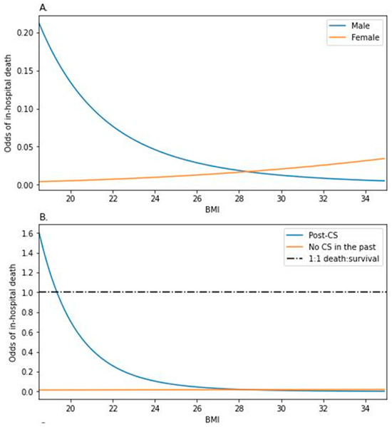 Based on the visualization of the statistical model (Figure 1B), one could argue about the contrast in the odds between the individuals of different CS statuses among the population with obesity. However, the odds ratio (post-CS/non-CS) rose as the BMI lowered, favoring the non-CS population for which the odds of death were constant in regard to BMI.