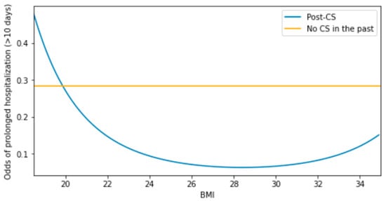 The interaction between BMI and the post-CS status was tested as significant by both the LR type 1 test (p = 0.018) and Wald test upon being featured in a full factorial model (p = 0.041, Table 4). The odds of a prolonged stay for a non-CS individual of 28.4 BMI (‘baseline’ individual) were estimated to be 0.284 (p < 0.001). A hypothetical non-CS individual of a different BMI would show the same odds (p = 0.166) compared to the baseline individual. However, an individual with a past CS experience and the same BMI as the baseline individual would show relatively lower odds (by 4.484-fold). This phenomenon stems from the finding that the odds in the post-CS stratum were significantly affected by BMI (p = 0.041). Based on the visualization of this classification model (Figure 2), one could assume that the impact of BMI on the odds, in the post-CS individuals, was positive among the patients with obesity or negative among individuals of BMI within its reference range (18.5–25.0).