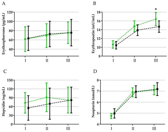 Changes in erythroferrone (A), erythropoietin (B), hepcidin (C), and neopterin (D) levels induced by ultramarathon in runners supplemented with vitamin D3 (green colour) and runners supplemented with placebo (black colour). Sampling: I, 24 h before the run; II, immediately after the run; III, 24 h after the run. * Significant difference vs. placebo (control) group 24h after the run detected at p ≤ 0.01.