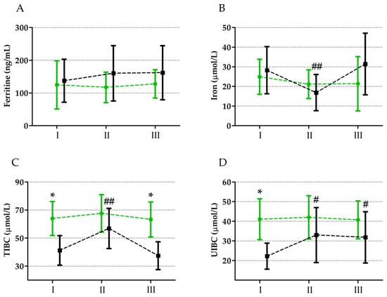 Changes in ferritin (A), iron (B), TIBC—total iron-binding capacity (C), and UIBC—unsaturated iron-binding capacity (D) levels induced by ultramarathon in runners supplemented with vitamin D3 (green colour) and with placebo (black colour). Sampling: I, 24 h before the run; II, immediately after the run; III, 24 h after the run. * significant difference between runners supplemented with vitamin D3 and placebo (control) group at a particular timepoints at p ≤ 0.01; # significant difference from baseline value in a particular group at p ≤ 0.01; ## significant difference from baseline value and 24 h after the run in a particular group at p ≤ 0.01.