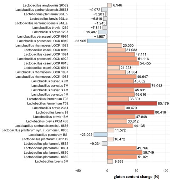 Gluten is a family of structural and storage proteins found in cereals such as wheat, barley and rye [1,2,3]. It makes up 85% of the total grain protein [4]. Gluten is composed of two main fractions—prolamins and glutelins [5]. Specifically in the case of wheat, these two fractions are referred to as gliadins and glutenins, respectively [6]. In barley, it is hordein and hordenin, respectively [7,8]. Prolamins in rye are known as secalins [9]. Gliadins are the underlying factor behind wheat allergy [10,11], while prolamins as a whole evoke the gastrointestinal disorder known as coeliac disease (also known as gluten-sensitive enteropathy) [12]. To minimize the exposure of these at risk, efforts are made to somewhat degrade gliadin at an early manufacturing stage of dough manufacturing [13] or fermentation [14] or to facilitate the digestion of gluten with an enzyme introduced to the gastrointestinal tract [15]. Otherwise, adherence to a gluten-free diet is the main resort in defense against associated symptoms [16]. Such a solution is however imperfect due to gluten contamination arising from cross-contact [17] and nutritional deficiencies in patients caused by the elimination diet [18,19]. Scientific literature hints that gluten content can be minimized with the use of gliadin-degrading microbiota used at the stage of sourdough fermentation [20].