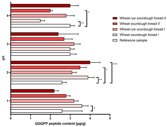 Figure 2. Immunoreactivity of gluten (±SD) determined in bread samples digested under different pH conditions corresponding to: hyperacidity (pH = 1 and 2), physiological pH = 3 upon food consumption and hypoacidity at pH = 4. Statistical significance by 2-way ANOVA at * p = 0.0215, 95% CI of diff. −1.879 to −0.1207 (pH = 1); * p = 0.0435, 95% CI of diff. −1.779 to −0.02065 (pH = 2); * p = 0.0218, 95% CI of diff. 0.1184 to 1.882; ** p = 0.021, 95% CI of diff. −2.179 to −0.4207 (pH = 2); ** p = 0.0015, 95% CI of diff. 0.5144 to 2.486 (pH = 4); *** p = 0.0009, 95% CI of diff. −2.279 to −0.5207.