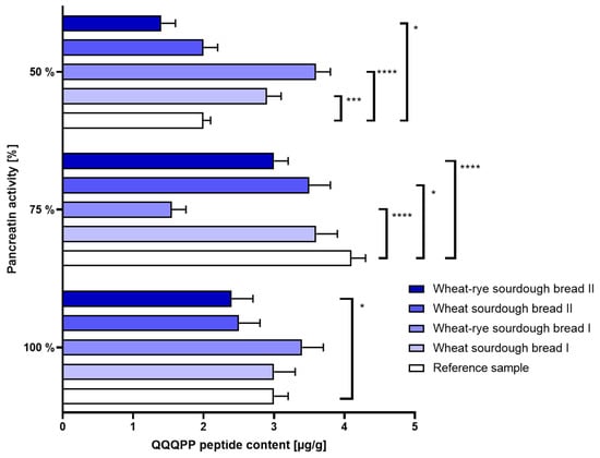 Figure 3. Immunoreactivity of gluten (±SD) determined in bread samples digested under different enzymatic conditions corresponding to 100%, 75% and 50% activity of pancreatin during intestinal phase of simulated digestion. Statistical significance by 2-way ANOVA at * p = 0.0165, 95% CI of diff. 0.09301 to 1.107; *** p = 0.0003, 95% CI of diff. −1.407 to −0.3930; **** p < 0.0001, 95% CI of diff. at 75% pancreatin: 2.043 to 3.057 (reference vs. wheat–rye sourdough bread I), 0.5930 to 1.607 (reference vs. wheat–rye sourdough bread II), 95% CI of diff. at 50% pancreatin: −2.107 to −1.093.