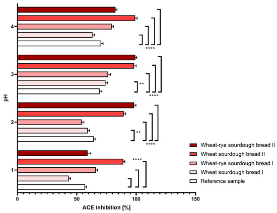 Figure 4. Inhibition of angiotensin-converting enzyme (±SD) determined in bread samples digested under different pH conditions corresponding to hyperacidity (pH = 1 and 2), physiological pH = 3 upon food consumption and hypoacidity at pH = 4. Statistical significance by 2-way ANOVA at ** p = 0.0014, 95% CI of diff. 1.770 to 8.430 (pH = 2),** p = 0.0022, 95% CI of diff. −8.230 to −1.570 (pH = 3), **** p < 0.0001, 95% CI of diff. at pH = 2: 10.27 to 16.93 (reference vs. wheat sourdough bread I), −12.43 to −5.770 (reference vs. wheat–rye sourdough bread I), −35.53 to −28.87 (reference vs. wheat sourdough bread II), 95% CI of diff. at pH = 2: 6.870 to 13.53 (reference vs. wheat–rye sourdough bread I), −28.43 to −21.77 (reference vs. wheat sourdough bread II), −37.13 to −30.47 (reference vs. wheat–rye sourdough bread II), 95% CI of diff. at pH = 3: −10.53 to −3.870 (reference vs. wheat–rye sourdough bread I), −32.23 to −25.57 (reference vs. wheat sourdough bread II), −33.43 to −26.77 (reference vs. wheat–rye sourdough bread II), CI of diff. at pH = 4: 3.568 to 11.03 (reference vs. wheat sourdough bread I), −12.14 to −5.462 (reference vs. wheat–rye sourdough bread I), −31.84 to −25.16 (reference vs. wheat sourdough bread II), −15.34 to −8.662 (reference vs. wheat–rye sourdough bread II).