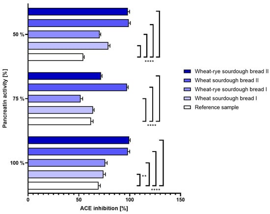 Figure 5. Inhibition of angiotensin-converting enzyme (±SD) determined in bread samples digested under different enzymatic conditions corresponding to 100%, 75% and 50% activity of pancreatin during intestinal phase of simulated digestion. Statistical significance by 2-way ANOVA at ** p = 0.0024, 95% CI of diff. −8.215 to −1.585; **** p < 0.0001, 95% CI of diff. at 100% pancreatin: −9.915 to −3.285 (reference vs. wheat–rye sourdough bread I), −32.21 to −25.59 (reference vs. wheat sourdough bread II), −33.41 to −26.79 (reference vs. wheat–rye sourdough bread II), 95% CI of diff. at 75% pancreatin: 6.785 to 13.41 (reference vs. wheat–rye sourdough bread I), −38.71 to −32.09 (reference vs. wheat sourdough bread II), −13.11 to −6.485 (reference vs. wheat–rye sourdough bread II), 95% CI of diff. at 50% pancreatin: −27.81 to −21.19 (reference vs. wheat sourdough bread I), −19.31 to −12.69 (reference vs. wheat–rye sourdough bread I), −48.01 to −41.39 (reference vs. wheat sourdough bread II), −47.01 to −40.39 (reference vs. wheat–rye sourdough bread II).