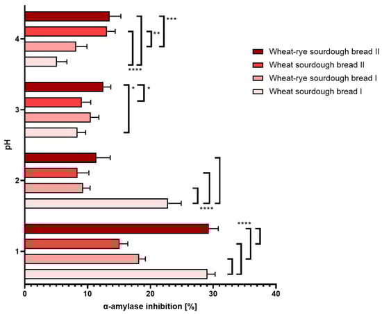 Figure 6. Inhibition of α-amylase (±SD) determined in bread samples digested under different pH conditions corresponding to hyperacidity (pH = 1 and 2), physiological pH = 3 upon food consumption and hypoacidity at pH = 4. Statistical significance by 2-way ANOVA at * p = 0.0478, 95% CI of diff. −6.775 to −0.02464 (wheat sourdough bread II vs. wheat–rye sourdough bread II); * p = 0.0125, 95% CI of diff. −7.475 to −0.7246 (wheat sourdough bread I vs. wheat–rye sourdough bread II); ** p = 0.0023, 95% CI of diff. −8.275 to −1.525; *** p = 0.0010, 95% CI of diff. −8.675 to −1.925; **** p < 0.0001, 95% CI of diff. at pH = 2: 7.525 to 14.28 (wheat sourdough bread I vs. wheat–rye sourdough bread I), 10.62 to 17.38 (wheat sourdough bread I vs. wheat sourdough bread II), −14.48 to −7.725 (wheat–rye sourdough bread I vs. wheat–rye sourdough bread II), −17.58 to −10.82 (wheat sourdough bread II vs. wheat–rye sourdough bread II), 95% CI of diff. at pH = 3: 10.12 to 16.88 (wheat sourdough bread I vs. wheat–rye sourdough bread I), 11.02 to 17.78 (wheat sourdough bread I vs. wheat sourdough bread II), 8.025 to 14.78 (wheat sourdough bread I vs. wheat–rye sourdough bread II), 95% CI of diff. at pH = 4: −11.77 to −4.226 (wheat sourdough bread I vs. wheat sourdough bread II), −12.17 to −4.626 (wheat sourdough bread I vs. wheat–rye sourdough bread II).
