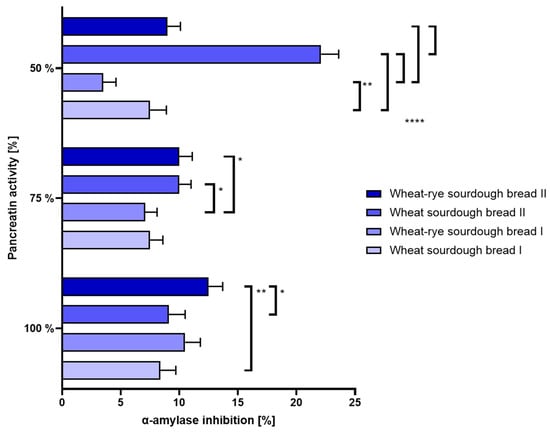 Figure 7. Inhibition of α-amylase (±SD) determined in bread samples digested under different enzymatic conditions corresponding to 100%, 75% and 50% activity of pancreatin during intestinal phase of simulated digestion. Statistical significance by 2-way ANOVA at * p = 0.0113, 95% CI of diff. −6.146 to −0.6544 (100%); * p = 0.0357, 95% CI of diff. −5.646 to −0.1544 (75%); ** p = 0.0021, 95% CI of diff. −6.846 to −1.354 (100%); ** p = 0.0026, 95% CI of diff. 1.254 to 6.746 (50%); **** p < 0.0001, 95% CI of diff.: −17.35 to −11.85 (wheat sourdough bread I vs. wheat sourdough bread II), −21.35 to −15.85 (wheat–rye sourdough bread I vs. wheat sourdough bread II), −8.246 to −2.754 (wheat–rye sourdough bread I vs. wheat–rye sourdough bread II), 10.35 to 15.85 (wheat sourdough bread II vs. wheat–rye sourdough bread II).