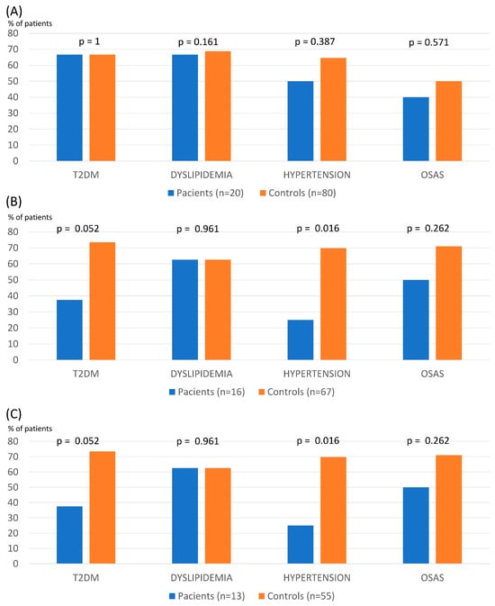 Remission of main obesity comorbidities at 1 (A), 3 (B), and 5 years (C) after bariatric surgery in patients with schizophrenia and controls (T2DM: type 2 diabetes; OSAS: obstructive sleep apnea syndrome).