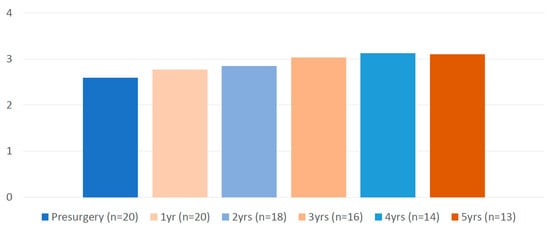 Concerning the evolution of psychiatric disease, two patients presented relapse of psychiatric symptoms during hospitalization (in the context of removal of psychiatric medication during the early postsurgical period). One patient relapsed during the early postoperative period (in the context of grief), and four patients presented psychiatric worsening that needed hospitalization during the five years of follow-up. As shown in Figure 2, the psychiatric medication burden did not change during follow-up.