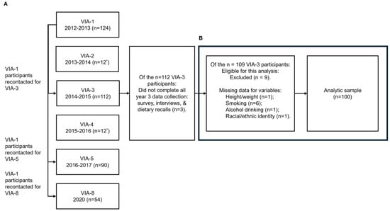 In terms of sample size, this study analyzed secondary data from participants in Year 3 of the VIA study, which did not include an a priori sample size calculation for testing associations. This analysis included all participants who completed interviews, dietary recalls, and surveys in Year 3 (n = 109). Data from participants who were missing data for the main exposure or outcomes (n = 1 missing BMI) or covariates: education (n =1), smoking (n = 6), or alcohol (n = 1) were excluded. Due to the small sample size, participants who reported “mixed or other” race or ethnicity were excluded from this analysis (n = 1). The final analytic sample included data from 100 participants (Figure 1).