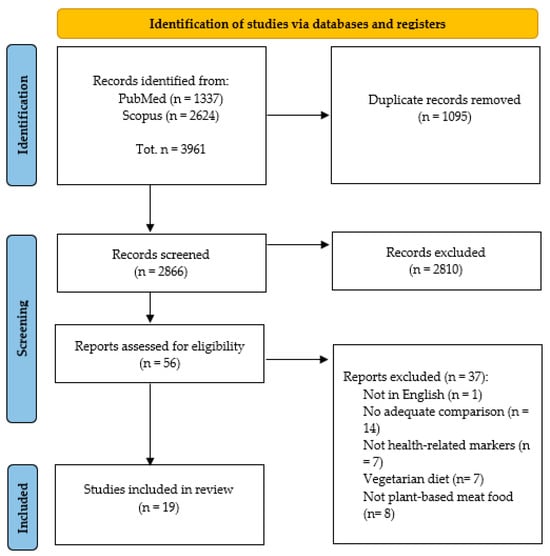 A total of 3961 records were initially identified from the search on PubMed® and Scopus. No additional results were identified through manual searches of reference lists. After 1095 duplicates were removed, the remaining 2866 studies were screened for their title and abstract, and 2810 were excluded. Among the 56 remaining studies, 37 records were excluded for not reporting results on any health markers, not being in English, or not providing a PBMA as the intervention.