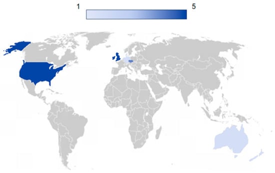 The countries in which the 19 studies included in the review were conducted are reported in Figure 2. The largest number of included studies (n = 5) was carried out in the United States and the United Kingdom, followed by the Czech Republic (n = 4). Germany, Denmark, Australia, New Zealand, and the Netherlands contributed with a single study each.